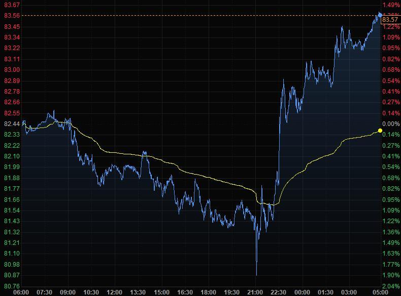美油尾盘涨逾1%,续刷近七年高点至83.65美元/桶,因此前EIA报告显示原油库存意外下降,缓解了对油价上涨可能削弱需求的担忧。