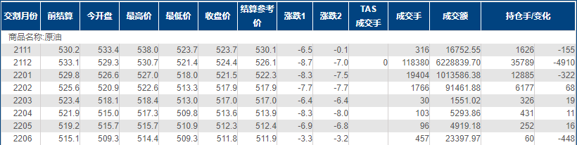 上海原油价格下跌,主力合约2112终盘收于524.4元/桶,跌8.7元/桶,跌幅1.63%。