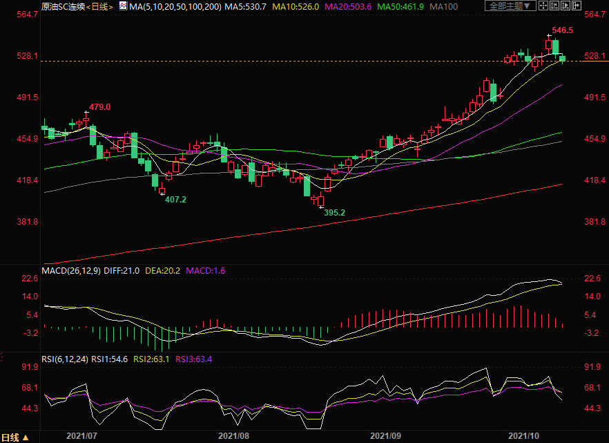 周三(10月20日)上海原油价格下跌,主力合约2112终盘收于524.4元/桶,跌8.7元/桶,跌幅1.63%,API数据显示原油库存增加329.4万桶,且日内大宗商品价格普遍下跌,这也拖累油价下行。