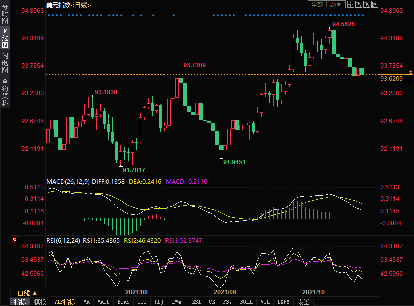 美元指数同样受到风险情绪升温的打击,恐慌指数本周为连续第三周下降,股市连续上涨,市场追逐更高的利润而放弃避险美元。