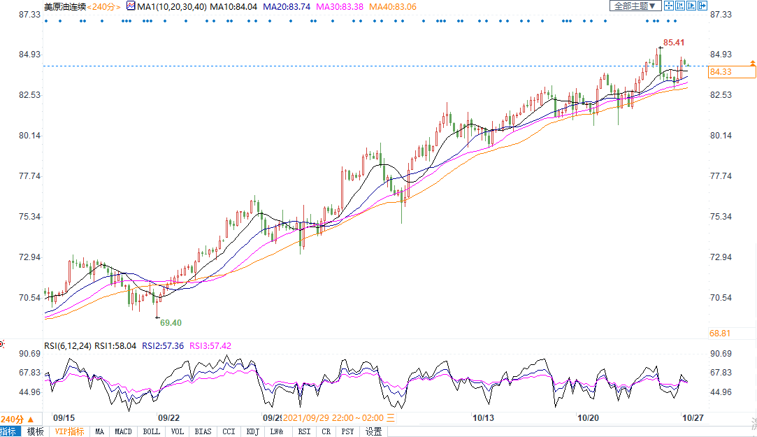 周二(10月26日)受助于全球供应短缺和全球最大石油消费国美国的强劲需求,美油涨近1%,保持在2014年来高位;布油上涨0.26美元,涨0.31%,报收85.43美元/桶。