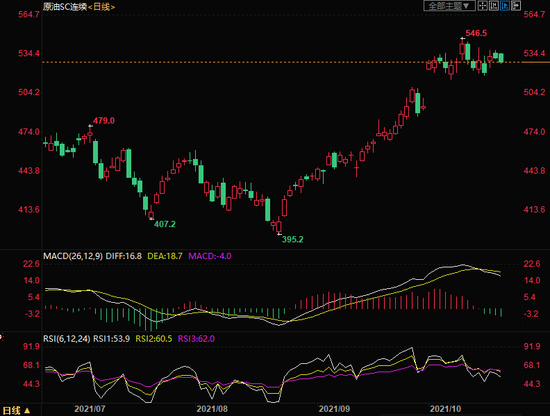 上海原油价格下跌,主力合约2112终盘收于528.3元/桶,跌5.9元/桶,跌幅1.1%。