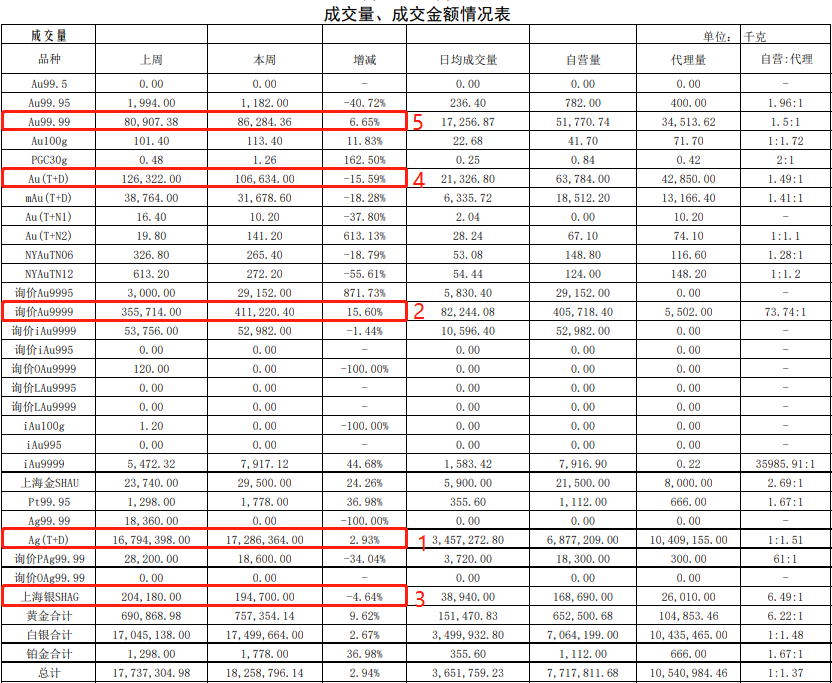 上海黄金交易所第40期行情周报:贵金属成交量均上涨