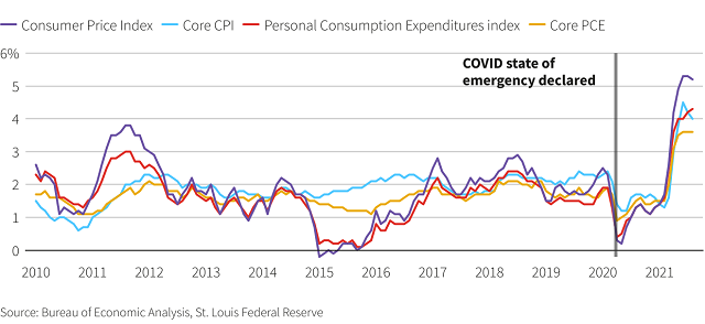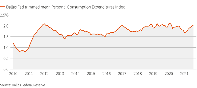 鲍威尔在8月的讲话中称:"到目前为止,通胀飙升主要是受疫情和经济重新开放直接影响的一小部分商品和服务的产物。"他指出,排除最强烈价格影响的其他通货膨胀指标仍然是温和的。但自他讲话以来,这些指标有所上升,反映出更广泛的价格上涨。