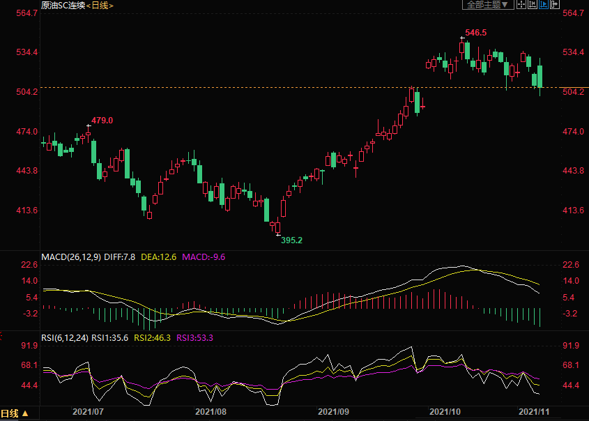 周五(11月5日)上海原油价格下跌,主力合约2112创9月30日以来新低至501.6元/桶,终盘收于508.5元/桶,跌5.1元/桶,跌幅0.99%,尽管OPEC+并未理会增产的呼吁,但有报道称,沙特的石油产量将很快超过1000万桶/日,这是自新冠大流行开始以来的首次。