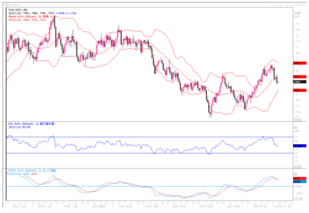 昨日英国央行意外鸽派的决定,英镑出现大跌,拖累澳元也跟随下行。之前,澳储行表示,应准备好保持耐心,加息条件可能需要一段时间才能到达。总体来看,澳储行的做法基本在市场的预期之中,没有超预期的鹰派,澳元在澳储行利率决议后剧烈震荡,随后转为下行,并在下破近期整理区间支持后加速走低。4小时图上,澳元兑美元跌破各短期均线之下,技术指标开始转向下行。若0.74强支撑完全失守,进一步的下行将考验9月份的低位区域0.7220支撑力度。