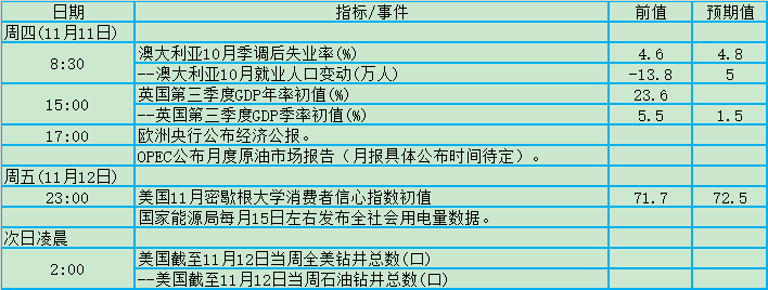 周四(11月11日)、周五(11月12日)关键词:澳洲失业率、英国GDP、OPEC月报、美国消费者信心