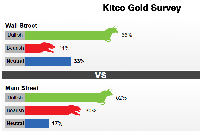 上周,18名华尔街分析师参加了Kitco News的黄金调查。在受访者中,有10名分析师(占56%)认为金价本周将上涨。与此同时,有2名分析师(11%)近期看空黄金,有6名分析师(33%)持中性看法。