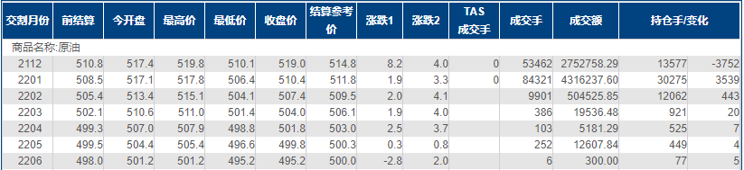 上海原油价格上涨,主力合约2201终盘收于510.4元/桶,涨1.9元/桶,涨幅0.37%。