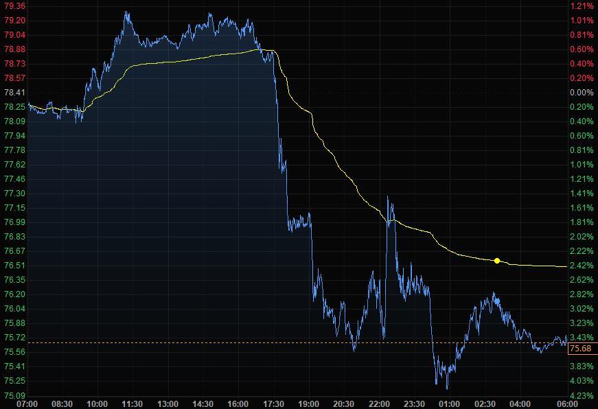 周一(11月22日)早盘,美原油低开低走,一度跌逾1%,创10月1日以来新低至74.76美元/桶。