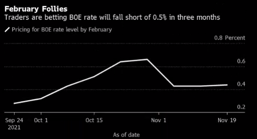 11月4日,决策者维持利率不变,令投资者措手不及。从那时起,贝利就试图强调提前加息的决定仍有前提,皮尔在上周五进一步强化这一观点。这些言论让人怀疑英国央行是否会在12月16日的下一次会议上加息,而金融市场已经消化了这一预期。