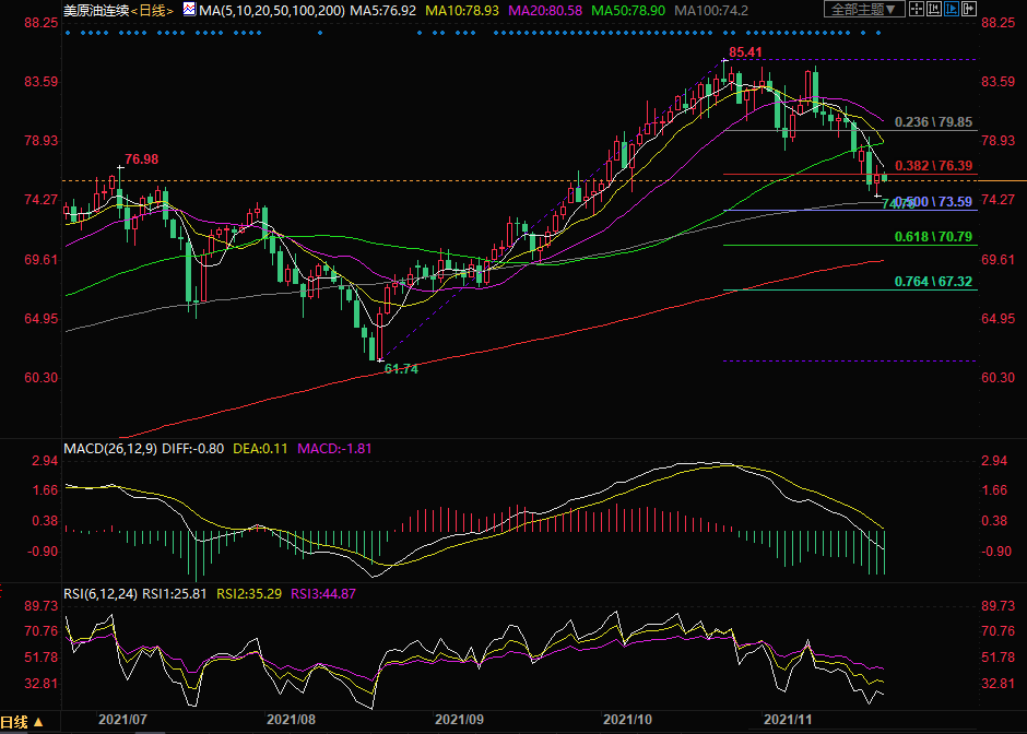 上方初步阻力关注5日均线76.92,进一步关注11月4日低位78.25以及23.6%回撤位79.85。