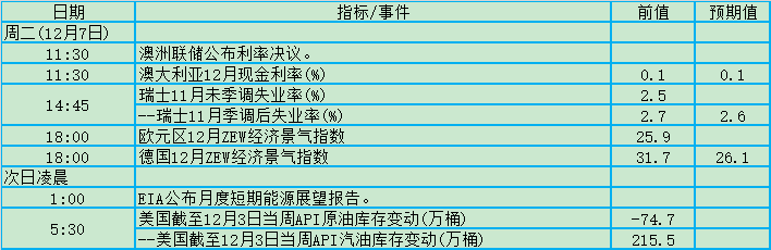 周二(12月7日)关键词:澳洲联储决议、欧元区景气指数、API库存