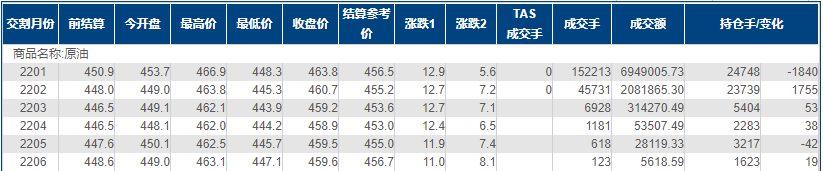 上海原油价格上涨2.86%,主力合约2201终盘收于463.8元/桶,涨12.9元/桶。