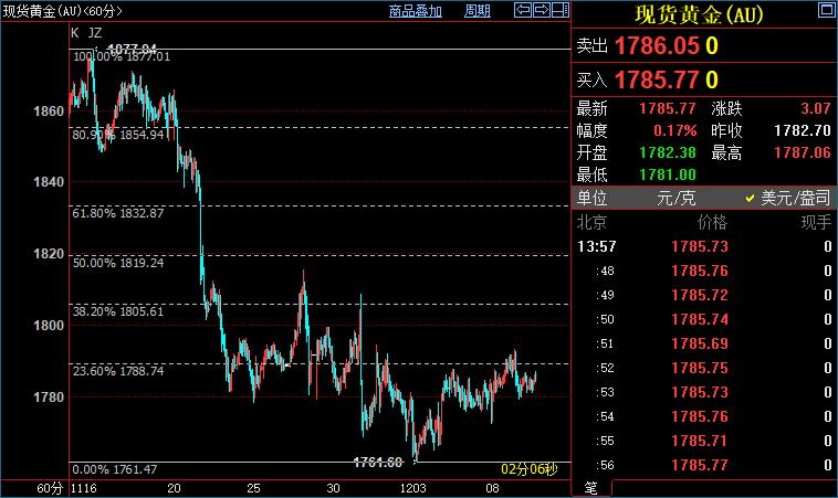 北京时间19:45,现货黄金下跌0.10%至1781.24美元/盎司;COMEX期金主力合约下跌0.20%至1781.9美元/盎司;美元指数上涨0.23%至96.116。