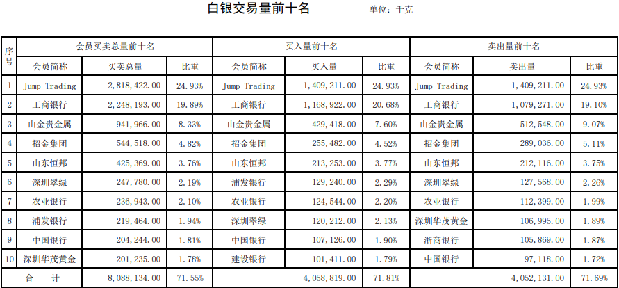 铂金交易方面,中国工美占据榜首位置,买入量达449千克,占比27.82%,工商银行第二,上海贺利氏第三。