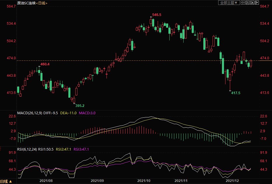 美联储将基准利率维持在0%-0.25%不变; 所有委员均预计美联储将在明年开始加息,具体为2022和2023年分别加息三次,并加快缩减购债速度,此次会议对市场释放了偏鹰派信号。关于“由暂时性因素引发通胀提升”表述删除,也意味着短期通胀仍将持续,为后续政策腾挪出空间。库存方面,EIA数据显示,截至12月10日当周美国除却战略储备的商业原油库存降幅超预期,精炼油库存和汽油库存降幅均大幅度超预期。当周EIA原油库存变动实际公布减少458.40万桶,预期减少170万桶,前值减少24.1万桶。此外,当周EIA汽油库存实际公布减少71.90万桶,预期增加205万桶,前值增加388.2万桶。当周EIA精炼油库存实际公布减少285.20万桶,预期增加100万桶,前值增加273.3万桶。库存全面下降,令市场回归涨势,阶段性油价将反复震荡运行。