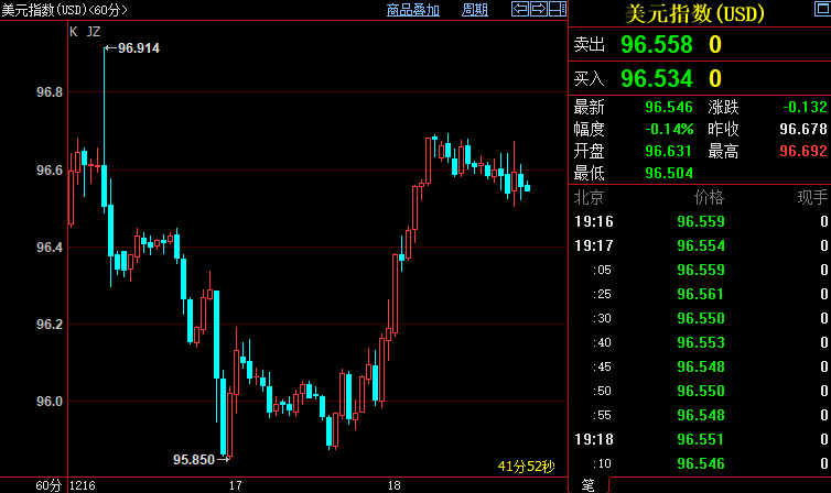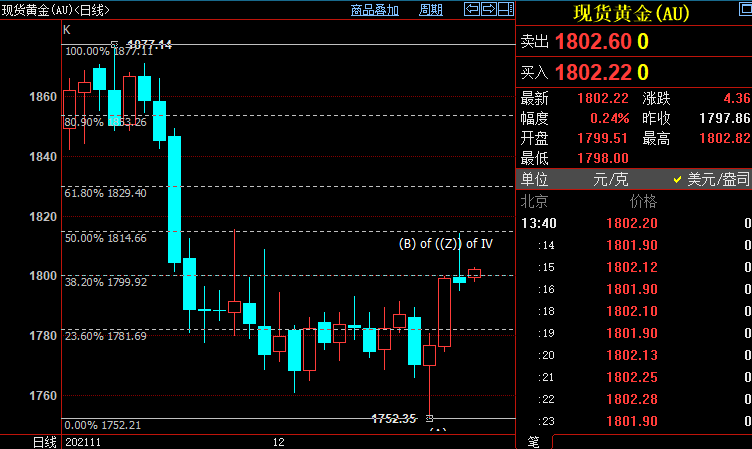 北京时间19:17,现货黄金下沉0.04%至1797.39美元/盎司;COMEX期金主力合约下跌0.40%至1797.7美元/盎司;美元指数下跌0.13%至96.561。