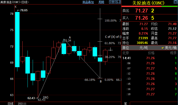 北京时间14:42,NYMEX原油期货上涨0.22%至71.28美元/桶;ICE布伦特原油期货下沉0.01%至73.97美元/桶。