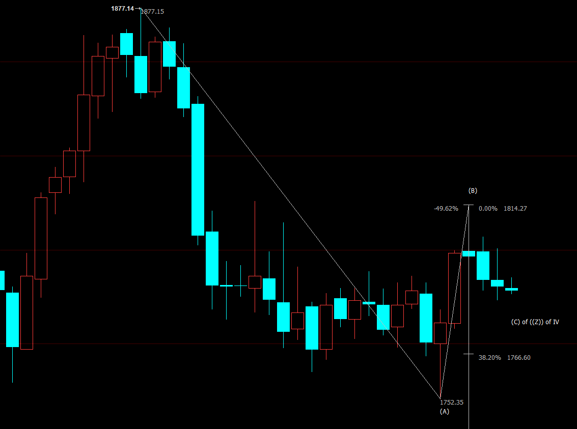 日线图上看,金价自1814美元开启下行(C)浪走势,下方支撑看向38.2%目标位1752美元。(C)浪是自1877美元开启的下行((Z))浪的子浪,((Z))浪则隶属于自2075美元开启的调整IV浪。