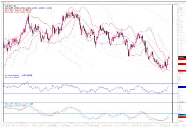 圣诞节过后欧元/美元略下跌,但仍处在1.1300 关口上方。上周五,市场流动性清淡,美元兑所有 G8 货币均出现上涨,但美元兑英镑却下跌 0.02%,仍维持 1.3400 的水平。然而,南非一项研究消息称,感染奥密克戎的新一代人需要住院治疗的可能性降低了 80%,这改善了市场情绪。欧元/美元日图显示维持下跌倾向,汇价处在均线下方。短线来看,欧元/美元2022年之前料将维持盘整。但近期欧元/美元构筑下降三角形形态,下跌目标锁定在 1.1186 附近的年初至今低点,但在下跌过程中将面临一些支撑。第一个支撑位是 1.1300 数字。若汇价跌破该水平,将测试12 月 15 日的周期低点 1.1221,随后是11月24日录得年初至今低点 1.1186。