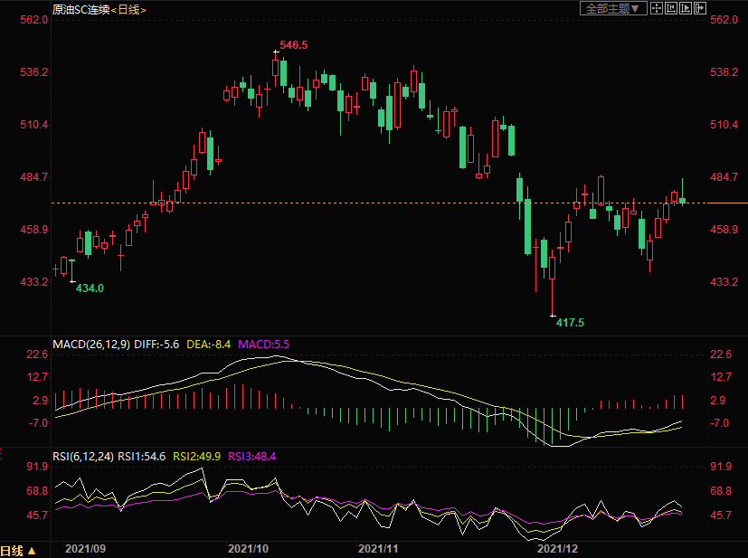 上海原油价格下跌0.42%,主力合约2202终盘收于472.9元/桶,跌2.0元/桶。