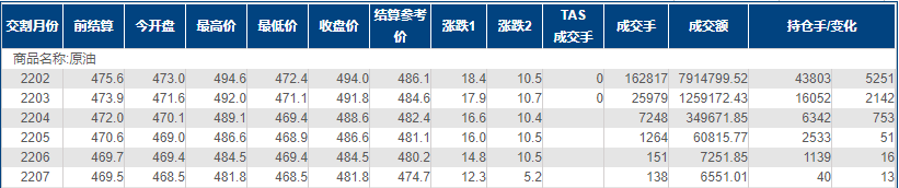 上海原油价格大涨3.87%,创一个月新高,主力合约2202终盘收于494.0元/桶,涨18.4元/桶。