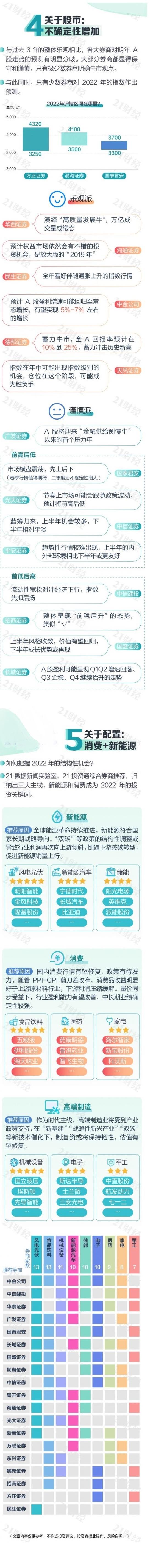 股市方面,大部分券商都显得保守和谨慎,只有极少数券商明确牛市观点,沪指点位区间为3250点-4320点。消费和新能源成为2022年的投资关键词。