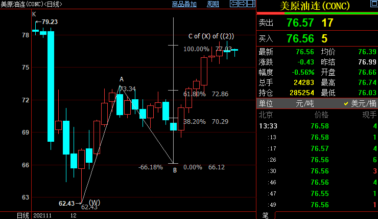 日线图上看,NYMEX原油自66.12美元开启上行C浪走势,升破100%目标位77.03美元,后市或进一步升向114.6%目标位78.62美元。C浪是自62.43美元开启的反弹(X)浪的子浪。(X)浪则是自85.41美元开启的调整((2))浪的子浪。日内油价重新下探76美元关口,若油价重回该价位下方,(X)浪可能终结。
