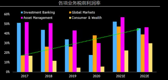 得益于业务结构调整,高盛的薪酬支出收入比可能将低于历史水平。花旗和美国银行等利息收入占比较大的银行,2021年的薪酬支出收入比将有所上升(与2020年类似),不过成本增速放缓以及利率上升应有助于美国银行降低2022年的薪酬支出收入比。而德意志银行正在经历重组,其薪酬支出收入比明年也有望下降。