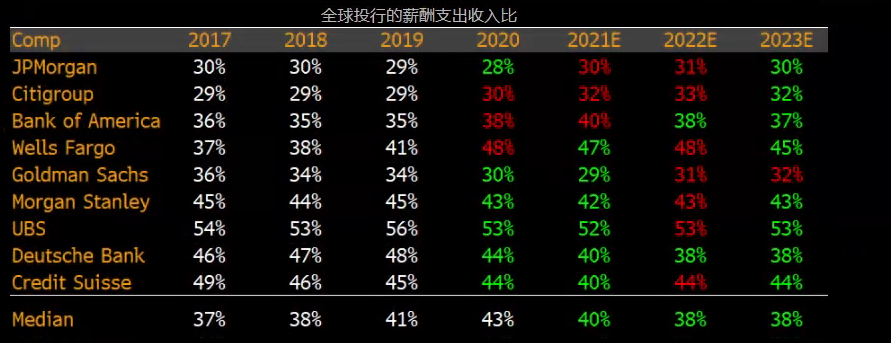 彭博行业研究 认为,2022年,全球各大投行的薪酬支出收入比或呈上行趋势,尽管我们预计,高盛、摩根士丹利、瑞银、德意志银行及瑞士信贷的这一关键指标仍将低于2019年的水平。与同业相比,这些银行更侧重于资本市场、财富及资产管理,而行业收入则可能保持在2020年以前的较低水平以上。这应能为银行的盈利能力提供支撑,尽管人才"抢夺战"依然激烈,且有大量积压业务。