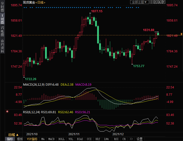 日线级别:金价突破1820一线阻力位之后,短线走势继续看涨。