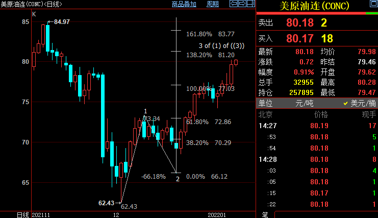 日线上看,NYMEX原油处于自66.12美元开启的上行3浪,料升破138.2%目标位81.20美元,并进一步上摸161.8%目标位83.77美元。3浪是自62.43美元开启的上行(1)浪的子浪。(1)浪则隶属于同样自62.43美元开启的上行((3))浪。