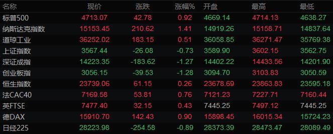 美股收盘情况:标普500指数上涨0.9%,报4713.07点;道琼斯工业平均指数上涨0.5%,报36252.02点;纳斯达克综合指数上涨1.4%,报15153.45点;纳斯达克100指数上涨1.5%,报15844.12点;罗素2000指数上涨1.1%,报2194.003点。