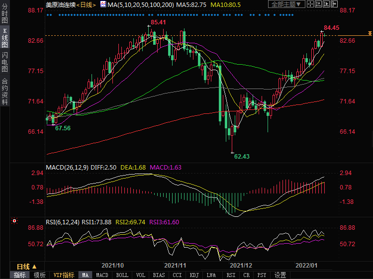 加之俄罗斯与乌克兰之间关系紧张,也支撑油价继续上行。预计短线挑战七年高位的概率较大,建议投资者继续逢低做多。