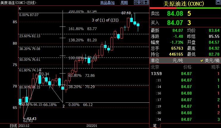 北京时间14:00,NYMEX原油期货上涨1.77%至84.05美元/桶;ICE布伦特原油期货上涨1.55%至87.01美元/桶。两市盘中一度跌逾3%,均创下本周新低,分别至82.78美元/桶和84.95美元/桶。