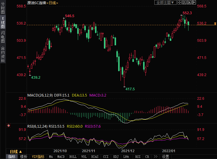 周二(1月25日)上海原油价格下跌1.24%,主力合约2203终盘收于533.8元/桶,跌6.7元/桶,投资者担心美联储可能比预期更快加息,导致股市等风险市场下跌。