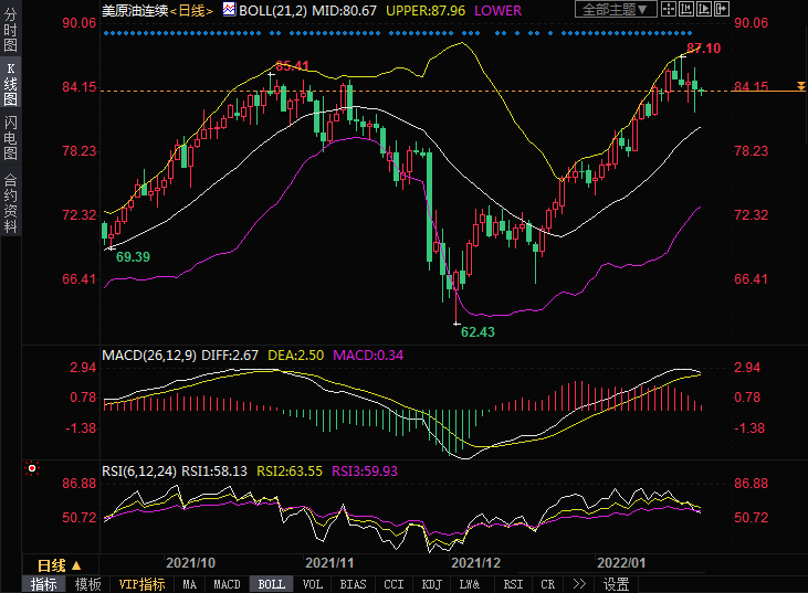 日线级别:油价目前高位持坚,基本面利好消息基本被消化,部分投资者在美联储加息预期升温的背景下开始获利了结。