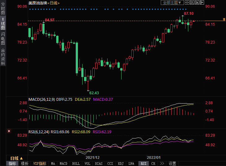 日线级别:油价近几个交易日始终在高位横盘震荡,多头涨势暂歇,但上涨潜力仍然较大。