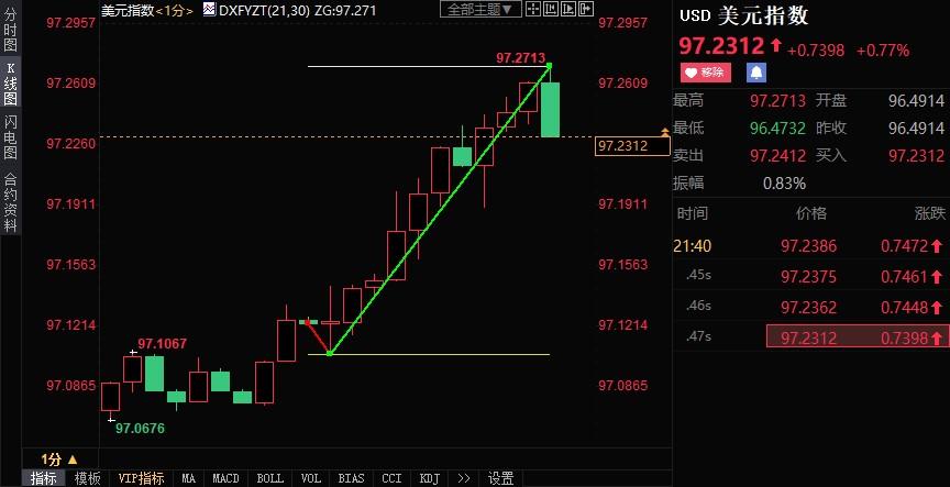 北京时间周四(1月27日)21:30,美国公布四季度GDP数据,表现远超前值,且明显优于预期。截至发稿,现货黄金下挫3.83美元至1802.63美元/盎司,美元指数跳升15点至97.27。