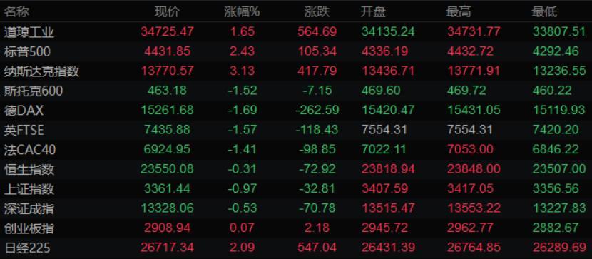 美股收盘情况:标普500指数上涨2.4%,报4431.85点;道琼斯工业平均指数上涨1.7%,报34725.47点;纳斯达克综合指数上涨3.1%,报13770.57点;纳斯达克100指数上涨3.2%,报14454.61点;罗素2000指数上涨1.9%,报1968.508点。