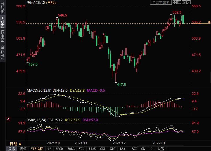 上海原油价格下跌2.03%,主力合约2203终盘收于534.5元/桶,跌11.1元/桶。