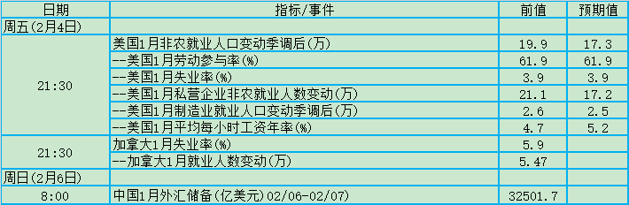 1月31日-2月6日当周,市场将迎来月度美国非农就业报告。此外,欧元区、新西兰、加拿大也将公布就业数据,欧元区还将公布GDP和通胀数据。