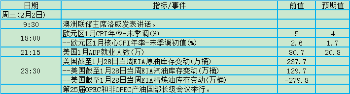 周三(2月2日)关键词:洛威、欧元区CPI、美国ADP、EIA