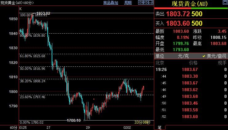 北京时间19:29,现货黄金上浮0.09%至1802.90美元/盎司;COMEX期金主力合约上浮0.11%至1803.5美元/盎司;美元指数下跌0.32%至95.962。