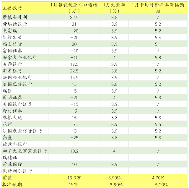 24家大型投行预测显示,主要投行对1月非农就业人口的增幅预期差距较大,但失业率和平均时薪年率预期较为接近。具体而言,美国1月季调后非农就业人口增幅料介于-40万至25万,失业率料介于3.7%-4.2%,平均时薪年率增幅料介于5.0%-5.5%。