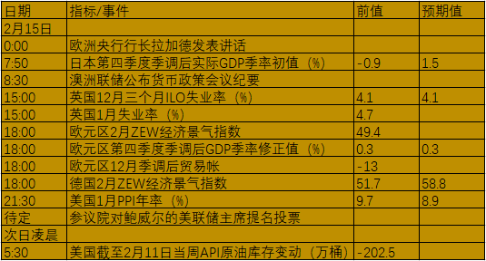 2月14日-20日当周,美国方面将公布PPI、零售销售、EIA及初请等重要数据,另外美联储还将公布1月会议纪要。其他国家需要关注的数据包括中国CPI、PPI,日本四季度GDP、英国失业率、欧元区信心指数等。美联储官员们也将会继续出面发表自己的货币政策主张。