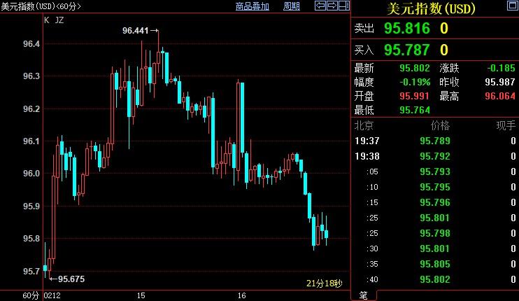 北京时间19:38,现货黄金上浮0.09%至1855.30美元/盎司;COMEX期金主力合约上浮0.03%至1856.7美元/盎司;美元指数下跌0.21%至95.798。