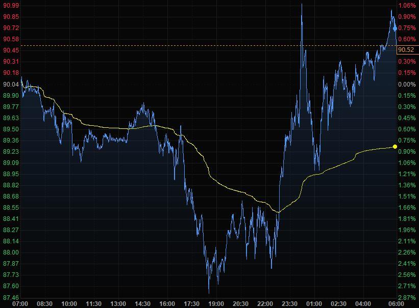 周一(2月21日)盘初,现货黄金一度走高7美元刷新近八个月高点至1906.39美元/盎司,美原油盘初一度上涨近2%至91.78美元/桶。