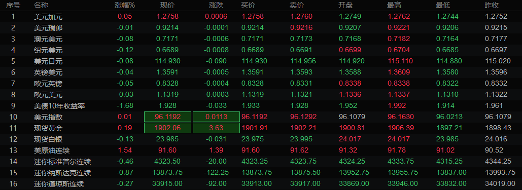 美元指数尾盘涨0.29%至96.10,扭转早盘跌势;美联储的Evans称货币政策立场是错误的,需要进行实质性调整;而Williams说他支持3月加息,没有充分论据支持3月份“迈出大步子”。